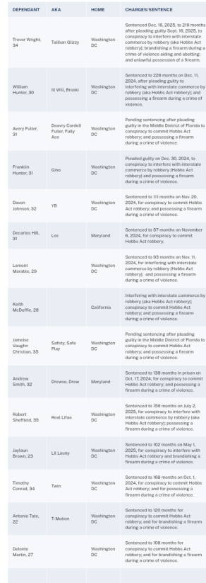 Wright, el rapero de DC conocido como «Taliban Glizzy», se declaró culpable el 16 de septiembre de 2025 de conspiración para interferir con el comercio interestatal mediante robo (también conocido como robo de la Ley Hobbs); blandir un arma de fuego durante un delito violento; y posesión ilegal de un arma de fuego.
