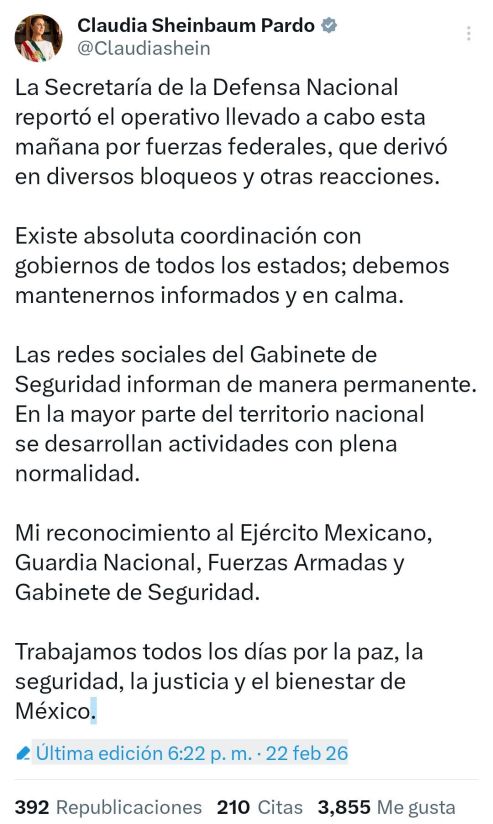 Oipol & Oijust Unidad OSINT Global Operación, comunicación y edición. 23 de febrero de 2026 | Comunicación Secretaría de la Defensa Nacional, 22 de febrero de 2026.- Lomas de Sotelo, Ciudad México – Se hace del conocimiento a la opinión pública que, con trabajos de inteligencia militar central, del Centro Nacional de Inteligencia y de la Fiscalía General de República (FEMDO), Fuerzas Especiales del Ejército Mexicano planearon y ejecutaron una operación en Tapalpa, Jalisco [oeste de México], en la que intervinieron diversas aeronaves de la Fuerza Aérea y la Fuerza Especial de Reacción Inmediata de la Guardia Nacional para lograr la detención de Ruben “N” (a) «Mencho».
