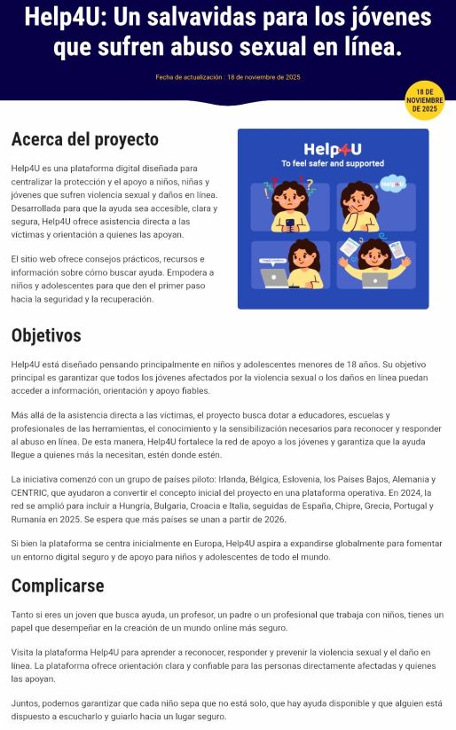 Además, en noviembre de 2025 se lanzó una nueva plataforma digital, Help4U , para apoyar a niños y adolescentes que sufren abuso sexual o daños en línea. Diseñada para ser sencilla, privada y accesible, Help4U ayuda a los jóvenes a encontrar asesoramiento confiable, comprender sus derechos y conectar con personas que pueden ayudarlos.
