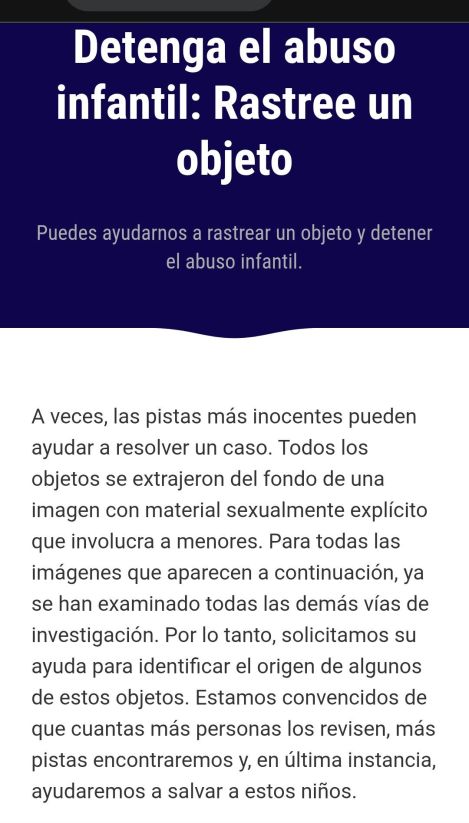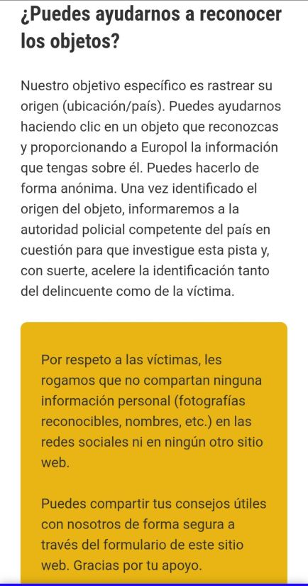 En la tercera semana de marzo de 2026, Europol publicó nuevas fotos en la plataforma «Alto al abuso infantil: localiza un objeto» , que invita a todos los ciudadanos a examinar objetos relacionados con casos sin resolver de abuso sexual infantil y comprobar si reconocen alguno. Ninguna pista es insignificante: incluso el detalle más pequeño podría ayudar a identificar y proteger a un niño víctima de abuso sexual.